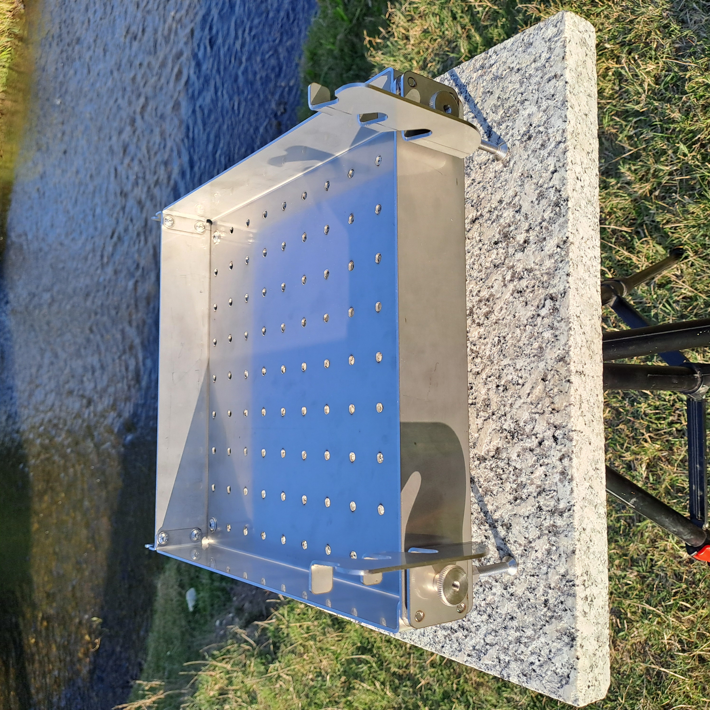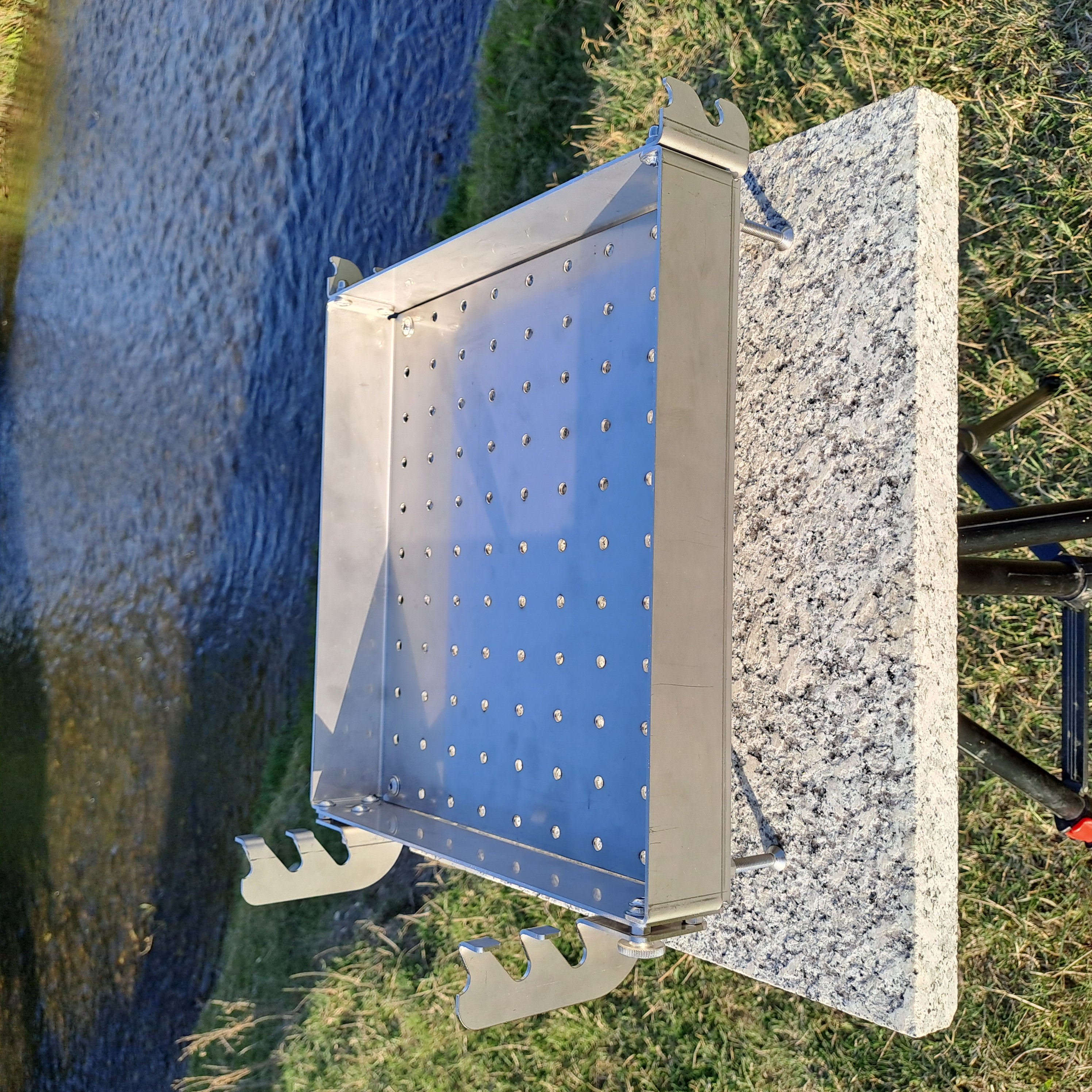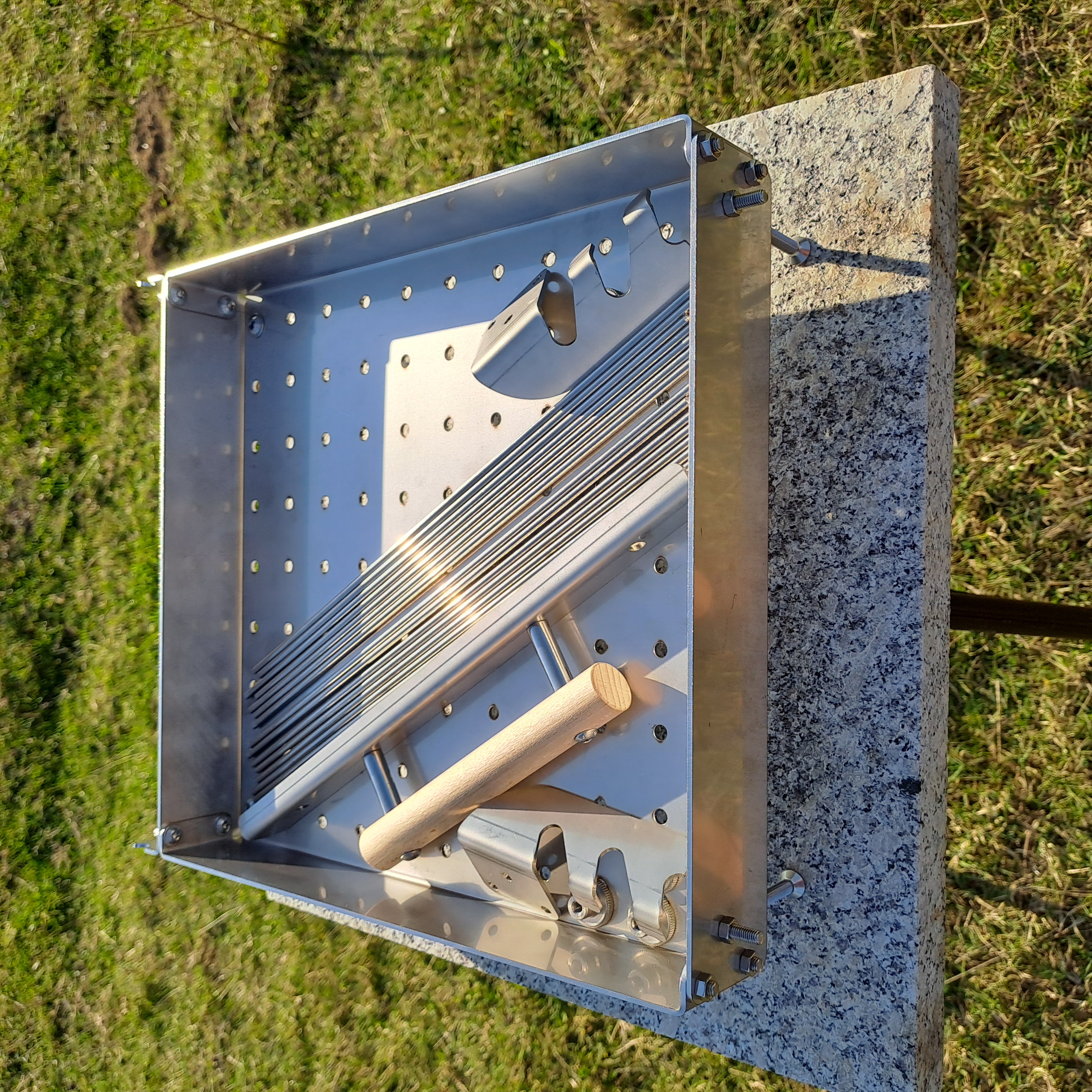 The fire box is 30 cm wide, 32 cm long, 5 cm deep. The depth of the box allows the use of almost all the coals/embers in an efficient way. The 6mm wide ventilation holes allow air supply to the coals/embers evenly throughout the volume.